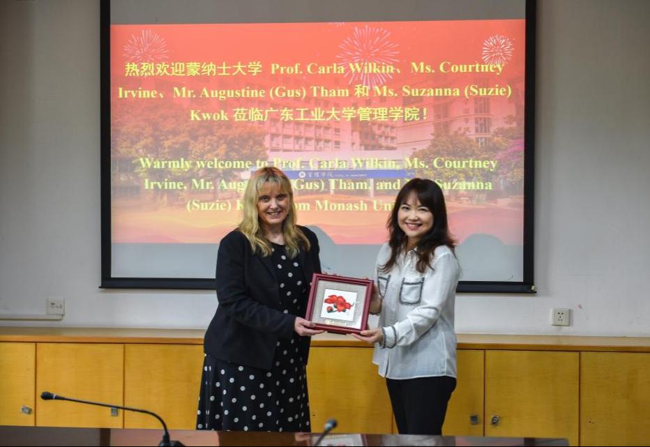 2025年10月28日下午,蒙纳士大学商学院代表团一行莅临广东工业大学管理学院,开展系列交流活动。代表团由商学院副院长(认证与国际事务) Carla Wilkin教授领衔,成员包括学生项目与合作事务经理Courtney Irvine女士;招生、大学市场推广与传播经理Augustine (Gus) Tham先生和全球项目与合作事务高级协调员Suzanna (Suzie) Kwok女士。
