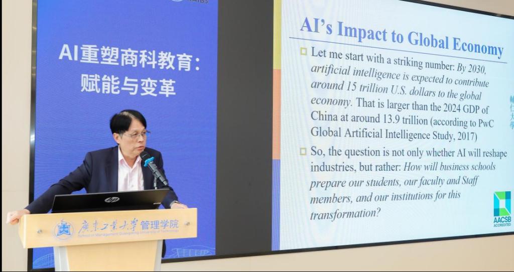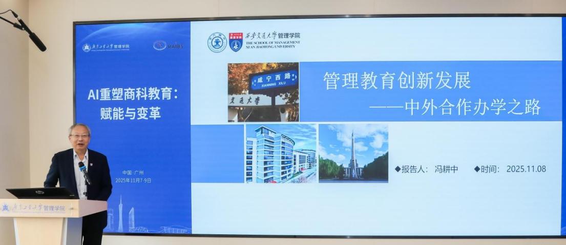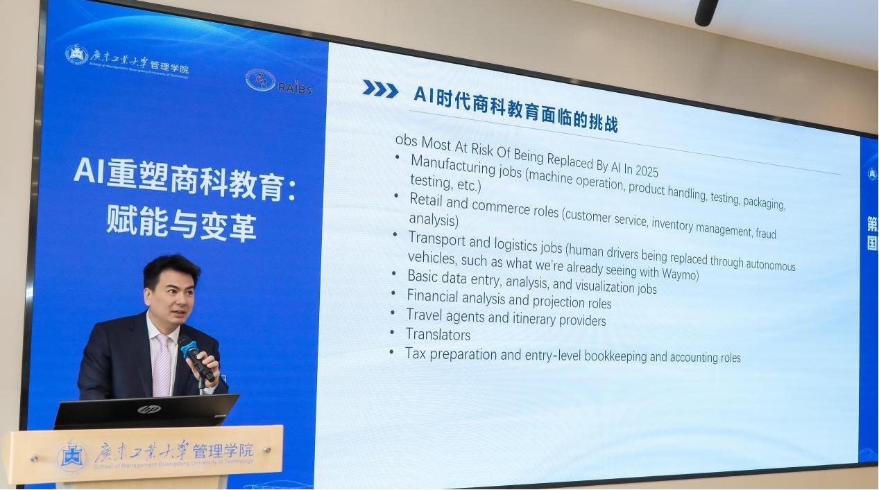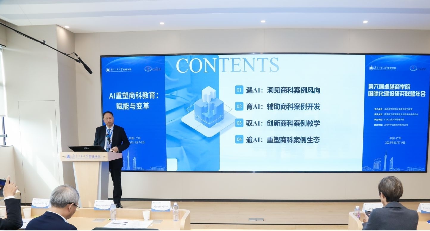 主旨报告第二部分由广东工业大学刘国胜教授主持。江西财经大学胡海波教授阐述了人机共生模式下商科案例教学创新路径;西安交通大学冯耕中教授解读了高等教育中外合作办学形势与创新之路;台湾辅仁大学李天行教授分析了AI对商学院创新与转型的赋能作用。
