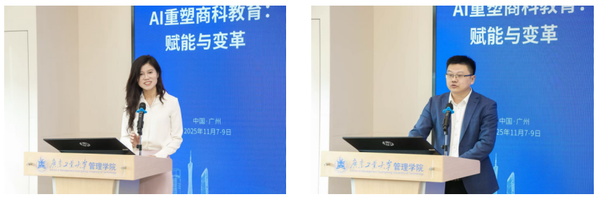 下午,广东外语外贸大学丁浩教授主持了主旨报告的第三部分。北京联合大学江晶晶教授从全球化-本土化的视角探讨了AI赋能商学院的发展路径;天津理工大学王京滨教授通过经济史和机制的分析提出通过经济制度转型探索AI时代的颠覆式创新;广东工业大学奚菁教授系统介绍了广工 MBA人才培养的“管工融合五星模式”创新与实践。