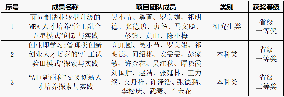 2025年12月25日,广东省教育厅、广东省人力资源和社会保障厅正式公布了2025年全省学校(高等教育)优秀教学成果奖(粤人社发[2025]47号)获奖成果名单,管理学院共获得一等奖两项、二等奖一项,其中广东省教学成果一等奖为来首次获得,刷新了学院近年来人才培养成果的新高度。