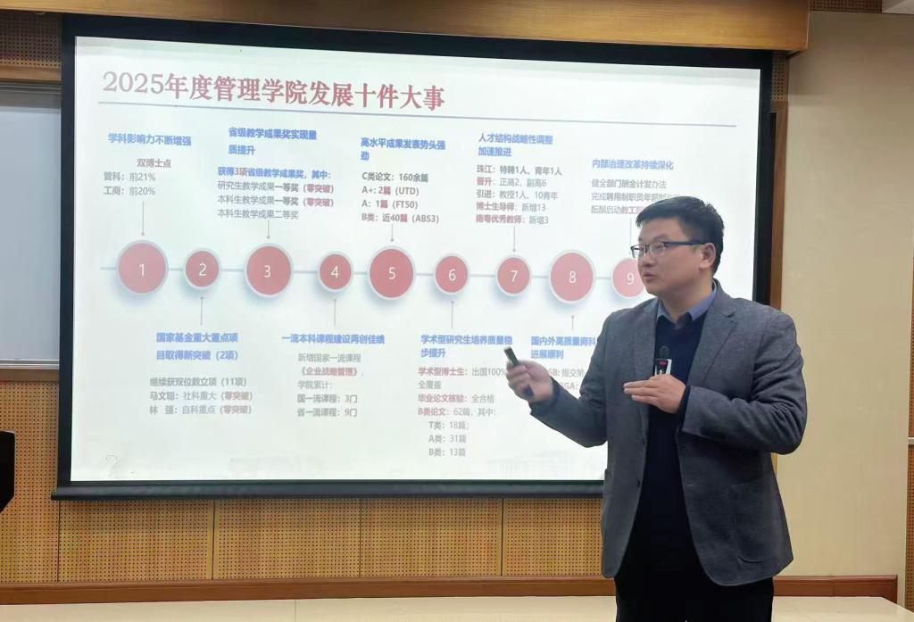 1月23日下午,管理学院召开教职工大会,总结回顾2025年学院事业进展,部署2026年重点任务和假期工作。院长吴小节盘点了2025年度学院发展十件大事,介绍了学院部门酬金计发办法和新修订的科研奖励管理办法,并布置了2026年重点工作。党委书记黄培清就假期师生安全、留校学生管理、教师因私出境、师德师风等问题作提醒。