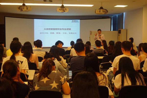 随后, 张军波副教授从研究方向、思路、框架、方法和实践应用五个方面为在场的师生带了主题为“从信息披露看财会专业逻辑”的精彩讲座。张教授首先为大家介绍了企业会计系统设计的初衷,用通俗易懂的话语教同学们看懂企业四张基本财务报表,随后结合几个公司的实际案例对财务数据背后的逻辑关系进行了深入解读。张老师的演讲充满激情、语言诙谐生动,让在场许多非会计专业的同学对财会专业也产生了兴趣。在互动环节中,师生们踊跃发言提问,奚教授和陈教授都耐心地一一解答,现场气氛十分热烈。