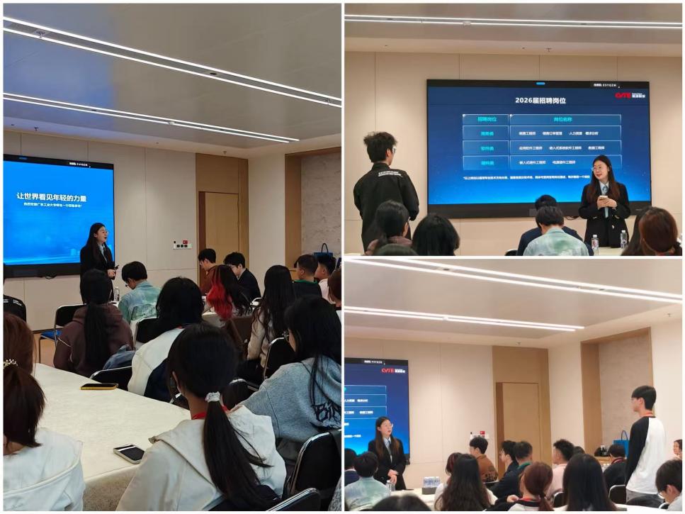 座谈会上,视源校园招聘总监王梦妍围绕2026届校招政策、岗位需求、职业发展路径等内容进行解读,针对同学们关心的实习安排、岗位技能要求等问题逐一答疑,现场氛围热烈。