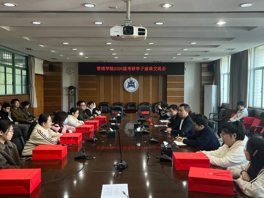 12月16日上午,管理学院于龙洞校区实验楼A北202举办2026届考研学子座谈交流会暨慰问活动。学院党委副书记何绍彬、2022级辅导员张辉、陈梓健、朱姝与30名考研学生代表齐聚一堂,面对面交流,心连心鼓劲,在寒冬中为奋战备考的学子送上学院的深切关怀和慰问。
