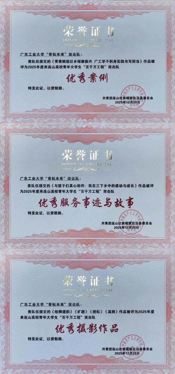 随后,活动举行颁奖仪式,为2025年度来连山高校“百千万工程”优秀突击队公布奖项并颁发荣誉证书。“青耘未来”突击队提交的《与孩子真心相伴:我在三下乡中的感动与成长》作品被评为2025年度来连山高校青年大学生“百千万工程”突击队“优秀服务事迹与故事”;《青春赋能壮乡瑶寨振兴广工学子躬身实践书写担当》作品被评为2025年度来连山高校青年大学生“百于万工程”突击队“优秀案例”;《绘狮遗韵》《旷趣》《授耘》《温拥》作品被评为2025年度来连山高校青年大学生“百千万工程”突击队“优秀摄影作品”。