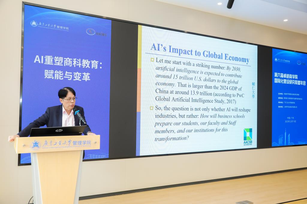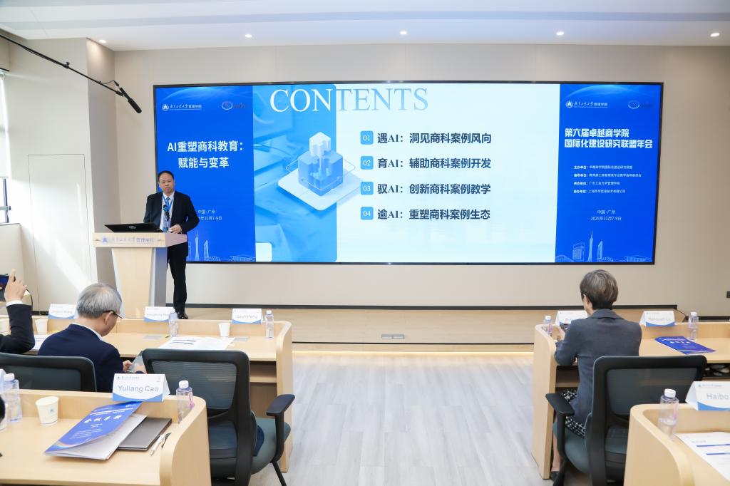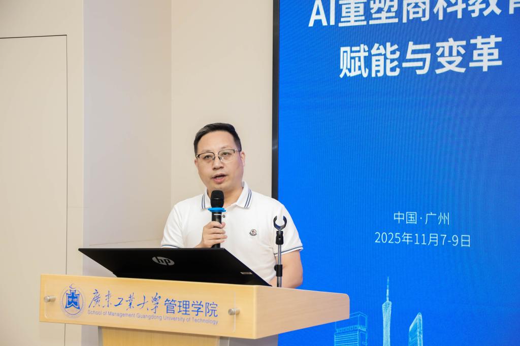 主旨报告第二部分由广东工业大学刘国胜教授主持。江西财经大学胡海波教授阐述了人机共生模式下商科案例教学创新路径;西安交通大学冯耕中教授解读了高等教育中外合作办学形势与创新之路;台湾辅仁大学李天行教授分析了AI对商学院创新与转型的赋能作用。