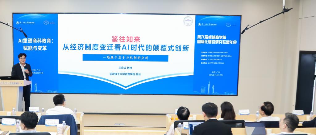 下午,广东外语外贸大学丁浩教授主持了主旨报告的第三部分。北京联合大学江晶晶教授从全球化-本土化的视角探讨了AI赋能商学院的发展路径;天津理工大学王京滨教授通过经济史和机制的分析提出通过经济制度转型探索AI时代的颠覆式创新;广东工业大学奚菁教授系统介绍了广工 MBA人才培养的“管工融合五星模式”创新与实践。